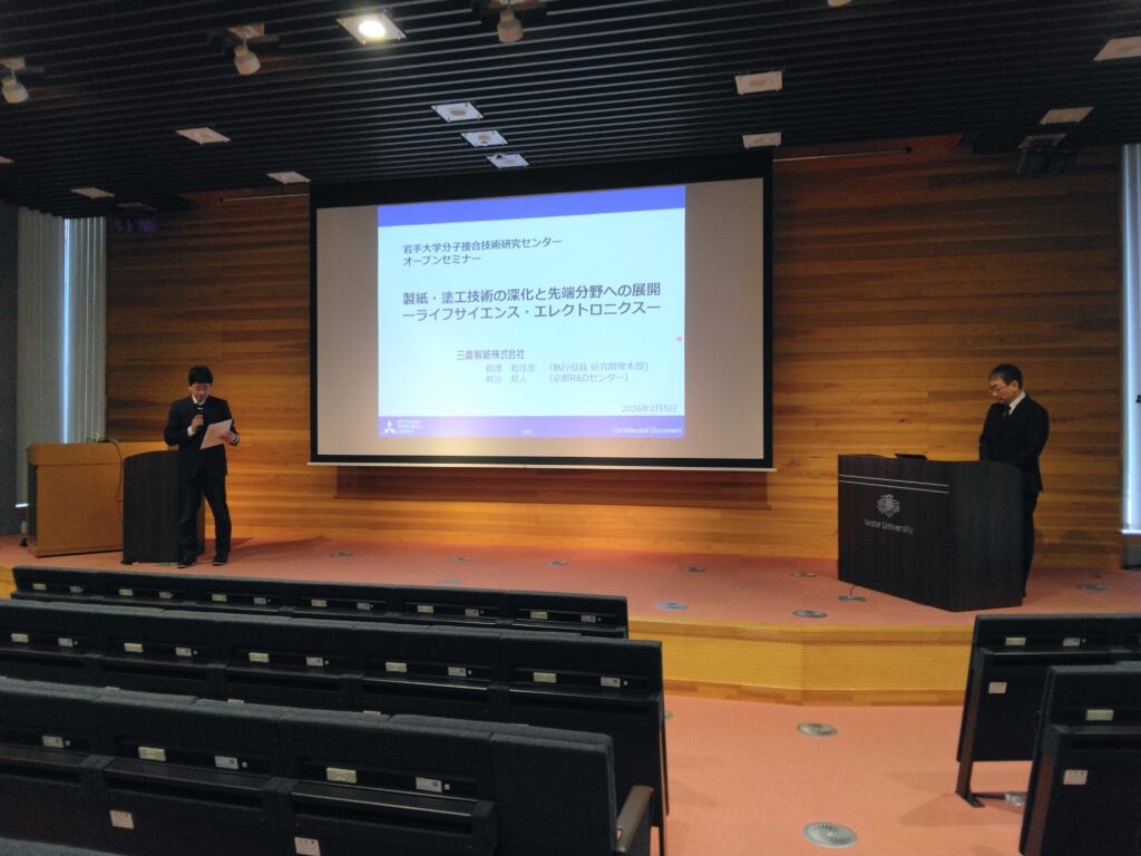 2026年2月5日に岩手大学理工学部復興祈念銀河ホールで三菱製紙(株)執行役員研究開発本部長の相澤和佳奈氏、同社京都R&Dセンター長の梶谷邦人氏と秋田大学総合環境理工学部長の寺境光俊氏をお招きしてセミナーを開催しました。また、本学からは農学部農学部地域環境科学科准教授の阪上宏樹准教授から講演いただきました。(グリーン表面界面ナノ工学ユニット(CSMIS)との共同開催)